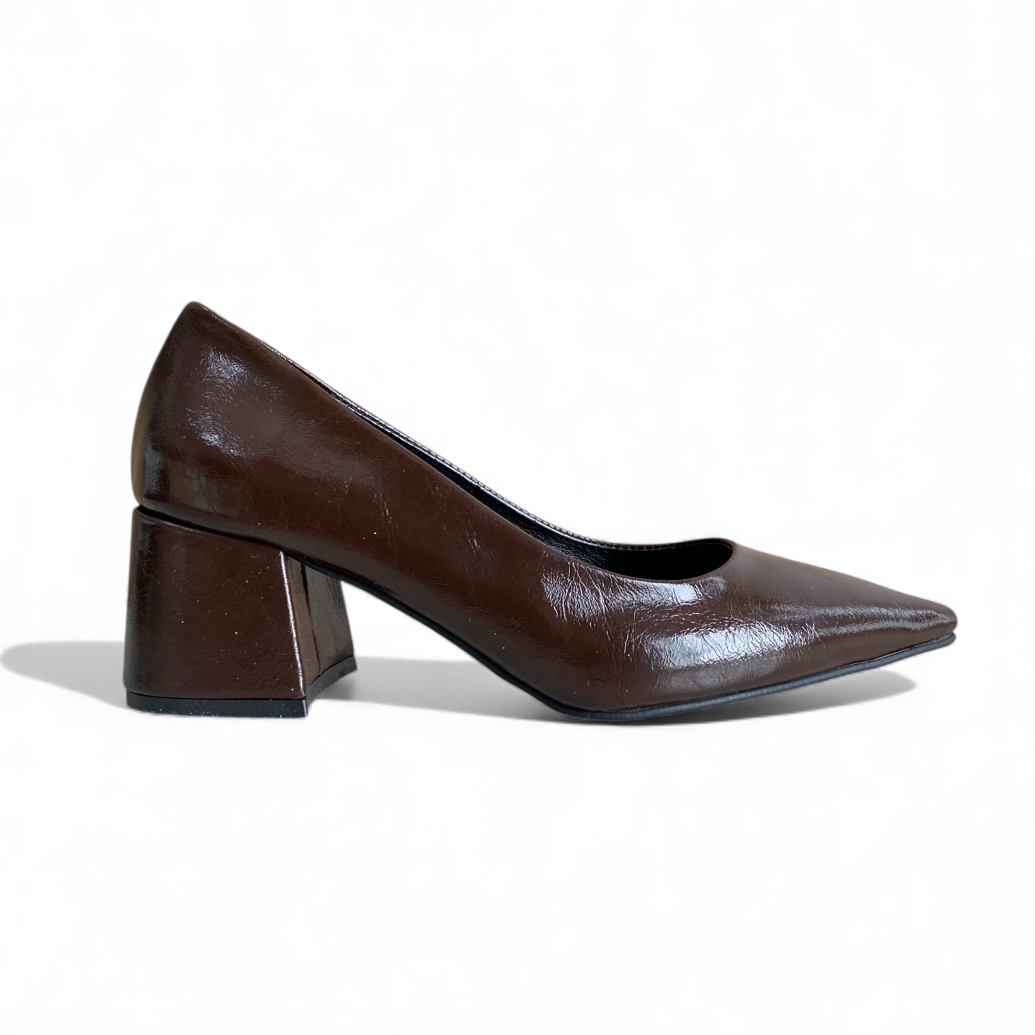 Μυτερές γόβες από γυαλιστερό υλικό σε κλασικό διαχρονικό σχεδιασμό με χοντρό τακούνι μεσαίου ύψους που προσδίδει μοντέρνα διάθεση, θα σας χαρίσει άνεση και σταθερότητα και θα αναδείξει κάθε outfit από το πρωί στο γραφείο εώς και την βραδινή σας έξοδο!
