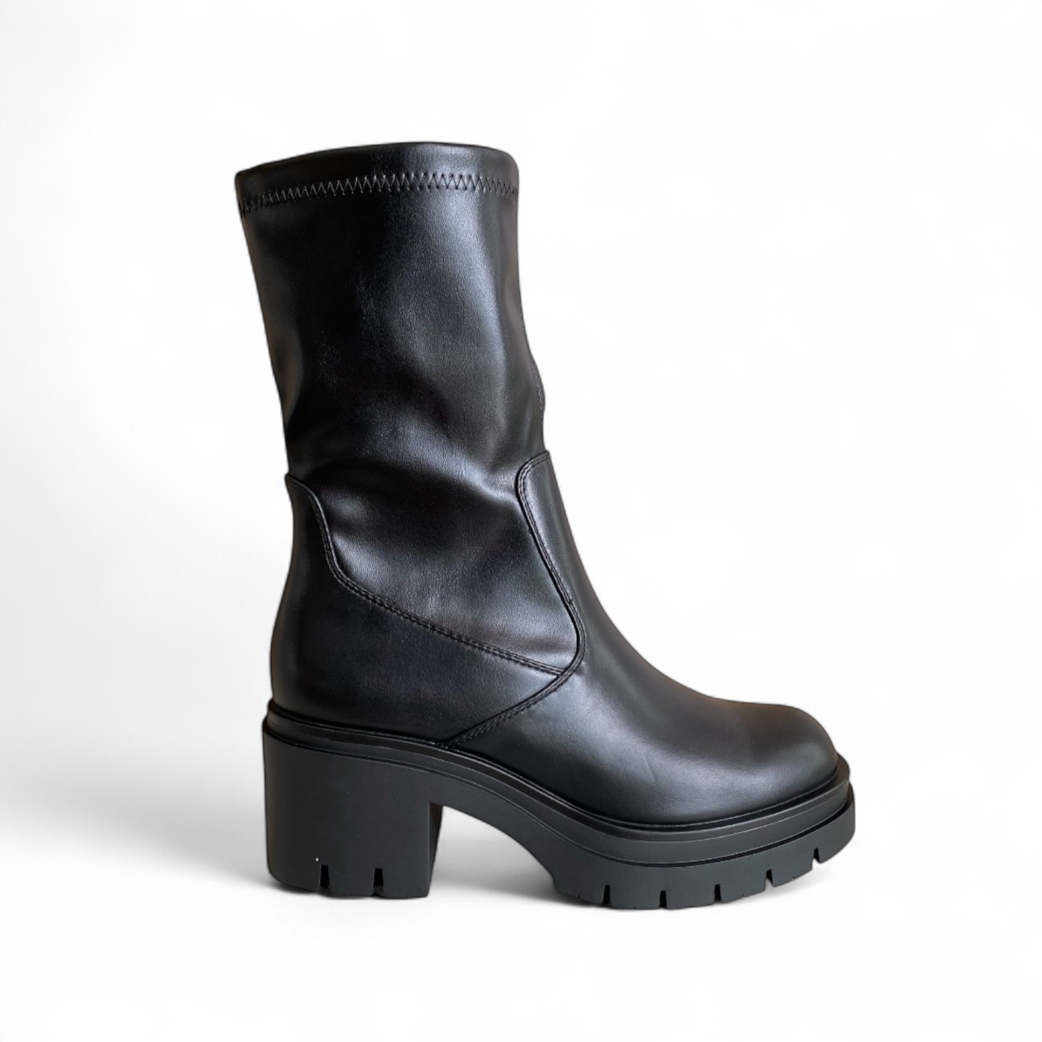 Γυναικεία μποτάκια τύπου κάλτσα με χαμηλό τακούνι και τρακτερωτή σόλα. Μια άνετη επιλογή για καθημερινή χρήση στη δουλειά και στη βόλτα. Διαθέτουν φερμουάρ στην εσωτερική πλευρά για εύκολη εφαρμογή.