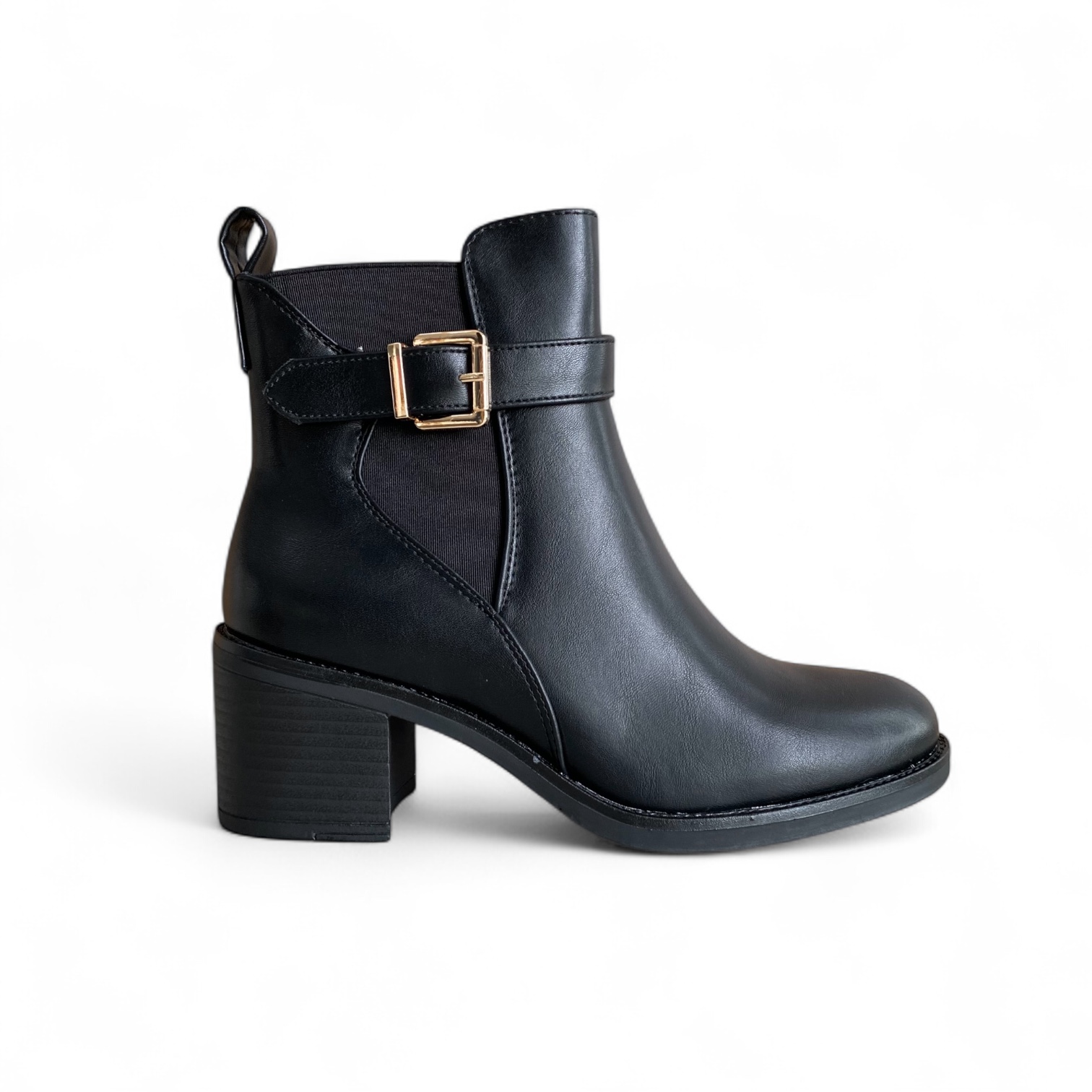 Γυναικεία μποτάκια με χαμηλό φαρδύ τακούνι που θα σας χαρίσει άνεση όλη τη διάρκεια της ημέρας. Διαθέτουν φερμουάρ στην εσωτερική πλεύρά και λάστιχο στην εξωτερική πλευρά για άνετη εφαρμογή.Διακοσμημένα με λουράκι και μεταλλική αγκράφα σε χρυσό χρώμα.
