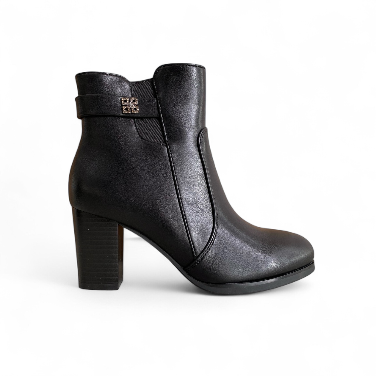 Γυναικεία μποτάκια με χοντρό τακούνι που θα σας προσφέρει άνεση και σταθερότητα κάθε στιγμή της ημέρας! Διαθέτουν φερμουάρ στην εσωτερική πλευρά και λάστιχο και διακοσμητικό λουράκι με μεταλλική λεπτομέρεια στην εξωτερική πλευρά.