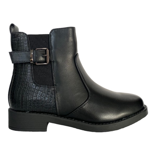 Γυναικεία χαμηλά μποτάκια με κροκό σχέδιο στη φτέρνα, λάστιχο με διακοσμητικό λουράκι με μεταλλική αγκράφα στην εξωτερική τους πλευρά και φερμουάρ στην εσωτερική. Με υφασμάτινη επένδυση τύπου τσόχας εσωτερικά.