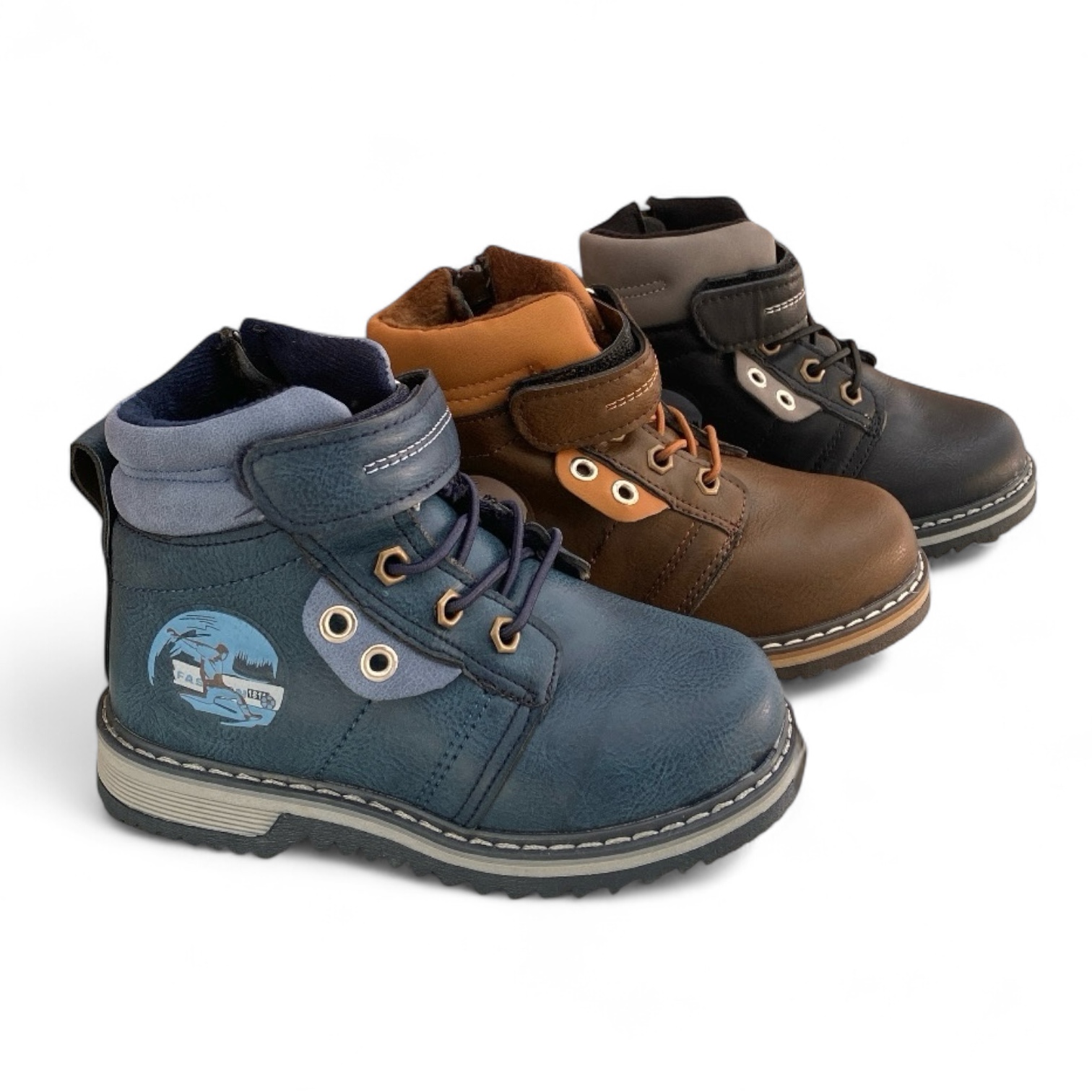 Αγορίστικα μποτάκια με φερμουάρ στην εσωτερική πλευρά, αυτοκόλλητο και λάστιχα στοκουντεπιέ για εύκολη χρήση και άνετη εφαρμογή.