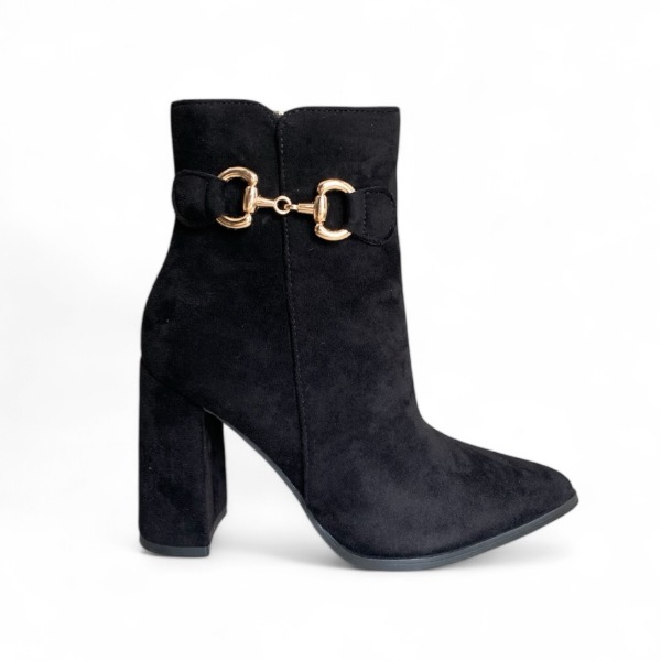 Γυναικεία μυτερά καστόρ μποτάκια με χρυσή λεπτομέρεια στην εξωτερική τους πλευρά και φερμουάρ στην εσωτερική. Με χοντρό ντυμένο τακούνι.