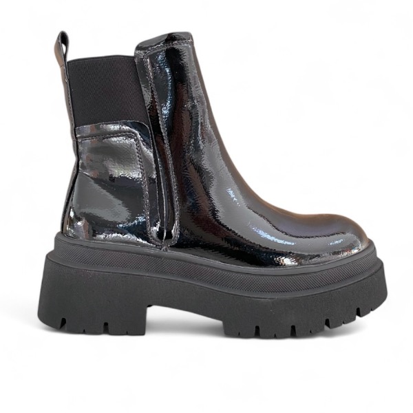 Γυναικεία δίσολα λουστρίνι μποτάκια με στρογγυλή μύτη.Με λάστιχο στην εξωτερική πλευρά και το πίσω μέρος και φερμουάρ στην εσωτερική πλευρά. Με υφασμάτινη επένδυση τύπου γούνας εσωτερικά και τρακτερωτή σόλα.