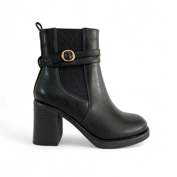 Γυναικείο μποτάκι με χοντρό τακούνι, φερμουάρ στην εσωτερική πλευρά και λάστιχο στην εξωτερική. Με διακοσμητικό λουράκι με μεταλλική χρυσαφί αγκράφα.