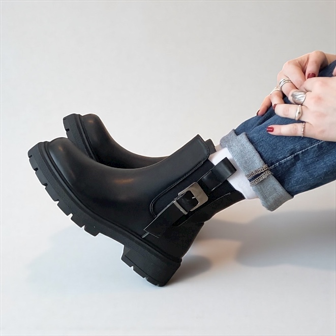Γυναικεία χαμηλά ματ μποτάκια με φερμουάρ στην εσωτερική τους πλευρά και λάστιχο με λουράκι με διακοσμητική αγκράφα στην εξωτερική. Με τρακτερωτή σόλα.