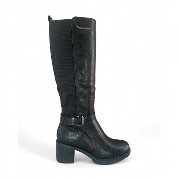 Μπότες με λάστιχο στο εξωτερικο μέρος και φερμουάρ στο εσωτερικό. Διαθέτουν φαρδύ τακούνι και μαλακό πάτημα για σταθερότητα και άνεση. Διακοσμείται με λουράκι με μια διακριτική ασημένια αγκράφα που προσφέρει κομψότητα στην εμφάνιση.