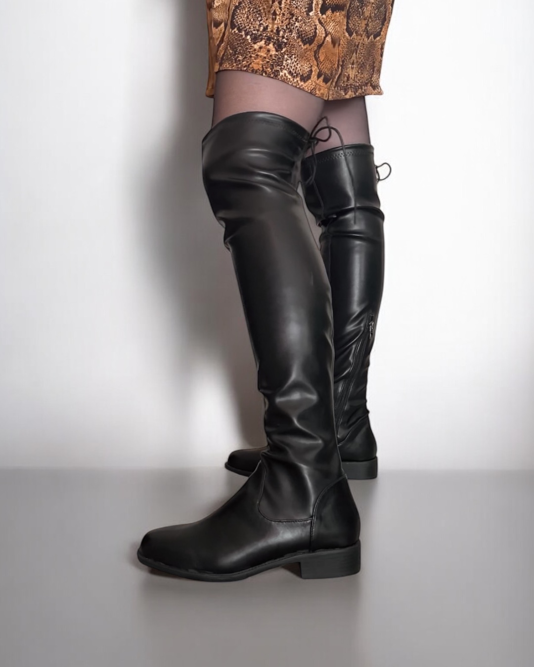 Μπότες πάνω από το γόνατο με στρογγυλή μύτη και φερμουάρ μέχρι τη μέση. Διαθέτουν κορδόνι στο τελείωμα που προσφέρει περισσότερη σταθερότητα. Ιδανικές για όλες τις ώρες της ημέρας καθώς διαθέτουν χαμηλό τακούνι και κομψή εμφάνιση.