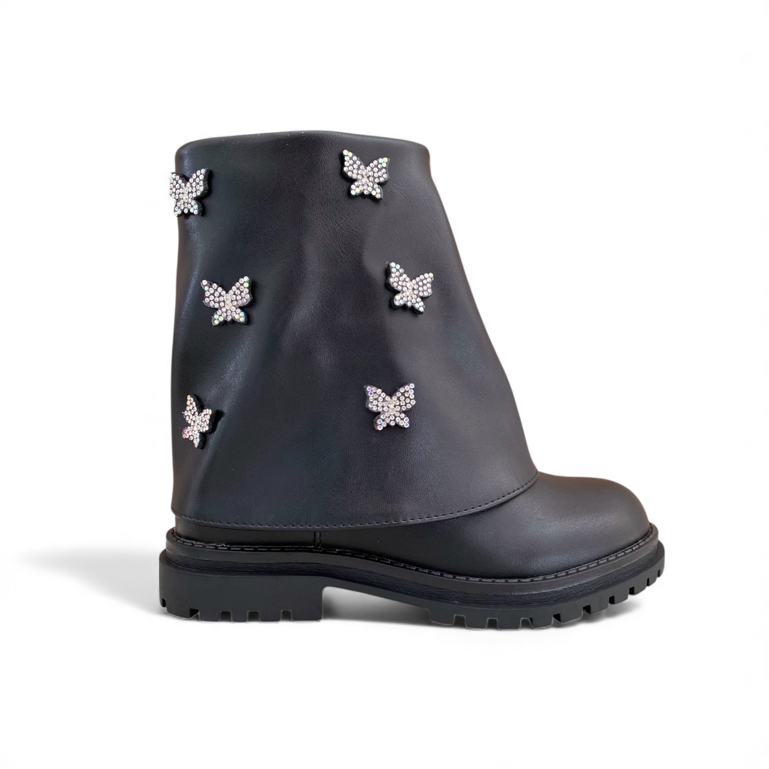 Παιδικά κοριτσίστικα μποτάκια με αναδιπλούμενη φάσα και διακοσμητικές πεταλούδες με στρας. Διαθέτουν φερμουάρ στην εσωτερική πλευρά για εύκολη εφαρμογή.