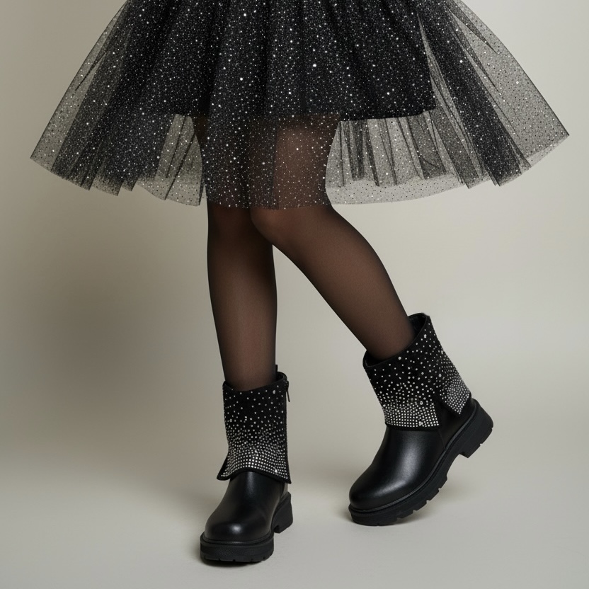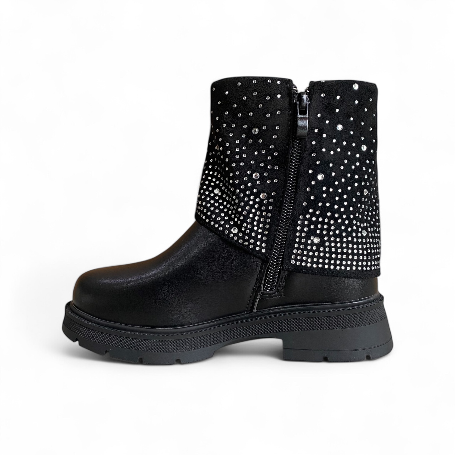 Παιδικά μποτάκια για κορίτσια από δερματίνη με αναδιπλούμενη φάσα από καστόρ υλικό με διακοσμητικά στρας και φερμουάρ στην εσωτερική πλευρά.